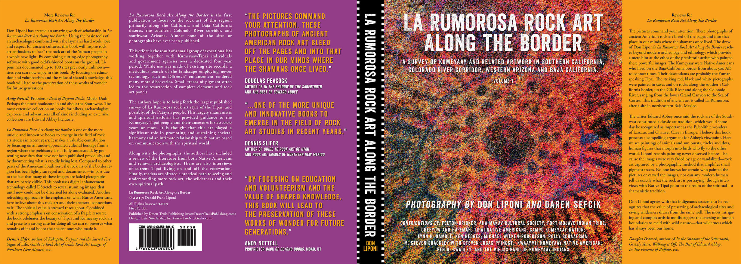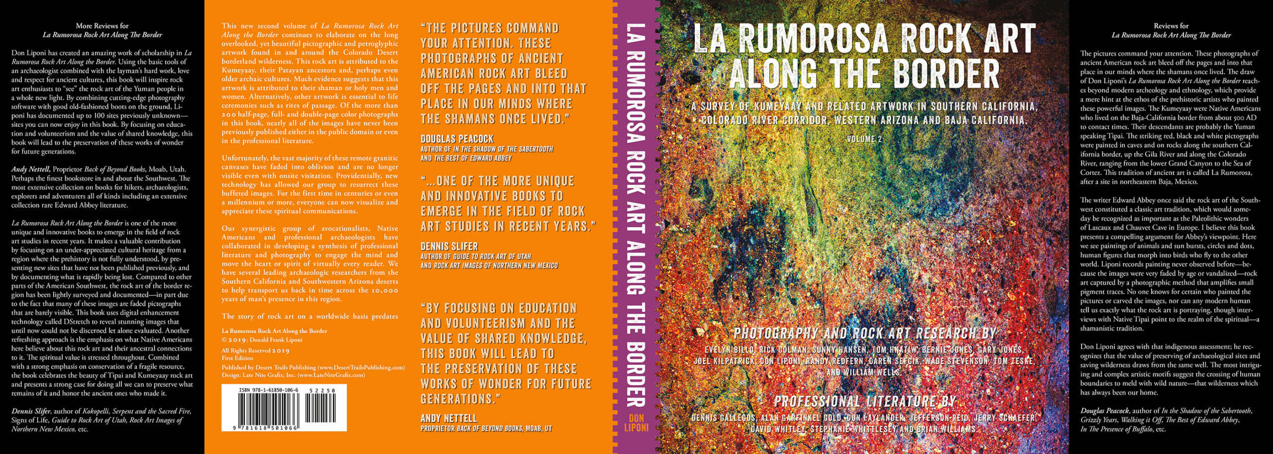 Don's original description of Volume 1: I was introduced to the desert and the Kumeyaay or Tipai Native Americans by my father as a teenager. My father was developing a small RV park in the Jacumba region and some of the Tipai men worked with him. They also showed us a number of sacred sites and art sites in the area. This initial exposure led me on a long road of discovery of the Southwest and the Colorado Plateau assisted by Fran Barnes, Michael Kelsey and Edward Abbey. Within my family, my father-in-law was an Apache from Globe, AZ, who was as solid as Wingate Sandstone and his lessons to me were just as immutable. In San Diego, I was very fortunate to be befriended by the inimitable Bob Begole who shared with me his skills of observation and passion for the Colorado Desert. The idealism and purity of what Bob was accomplishing has always stayed with me and it has served all of us well. Bob’s influence led to meeting many other desert devotees including Daren Sefcik. Daren is so devoted to exploring and experiencing the land. His hiking abilities are so far superior to mine as are his skills in finding traces of pigment. He was the perfect complement to work on this book. We both wanted to take the reader to places that they probably could not go or find. We had plenty of help from the skills of friends Gary, Jeff Joel, Ken, Rick, Tom, Wade, and Will over the past three years. Enjoy the book, but please, as you can, help us save what is left of this spiritual communication of the Tipai. As successful and peaceful caretakers of this land for the past 15,000 years, they have much to teach us.